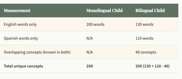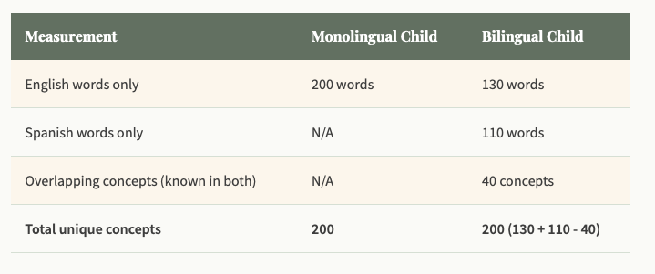 But here's what that single-language measurement misses. A bilingual child might know "dog" in English but "gato" (not "cat") in Spanish because they heard each word in different contexts. They might know food words primarily in Spanish (because that's the language used at mealtimes) and school words primarily in English. Each language captures different experiences and contexts.