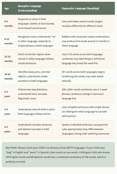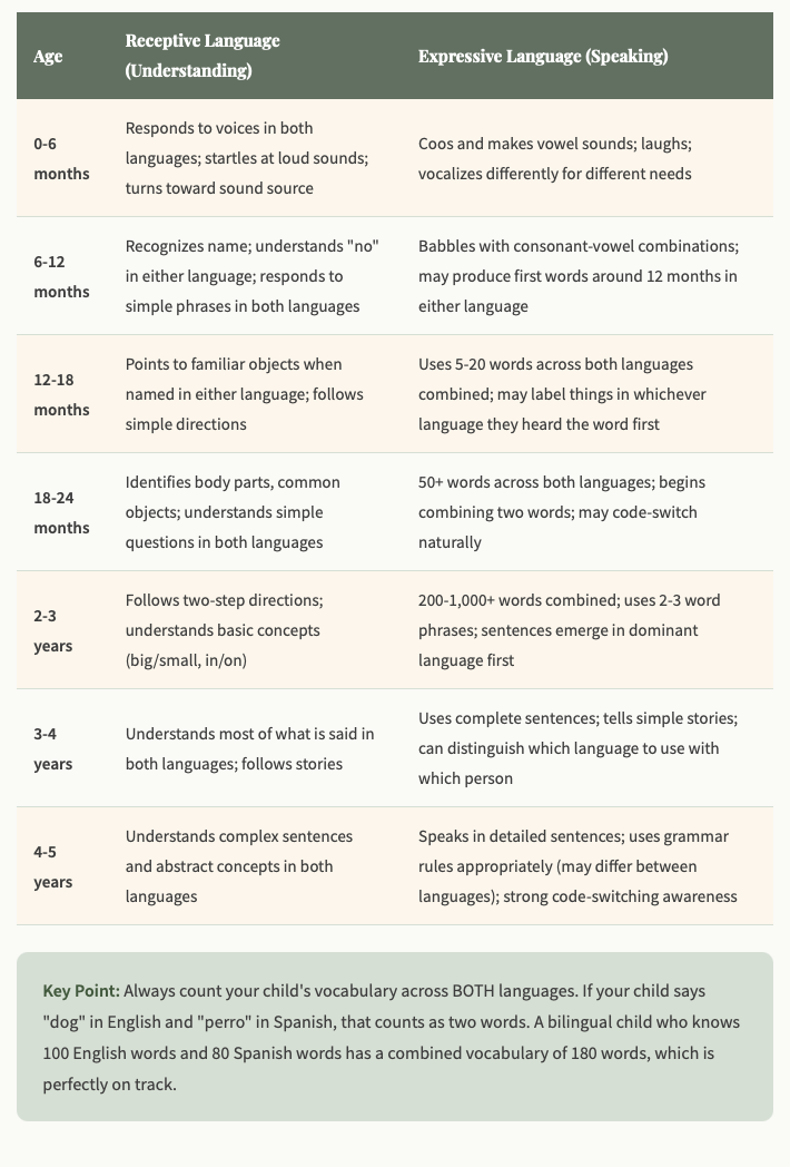 Bilingual children follow the same developmental timeline as monolingual children. The milestones below apply to your child's combined language abilities across both languages.